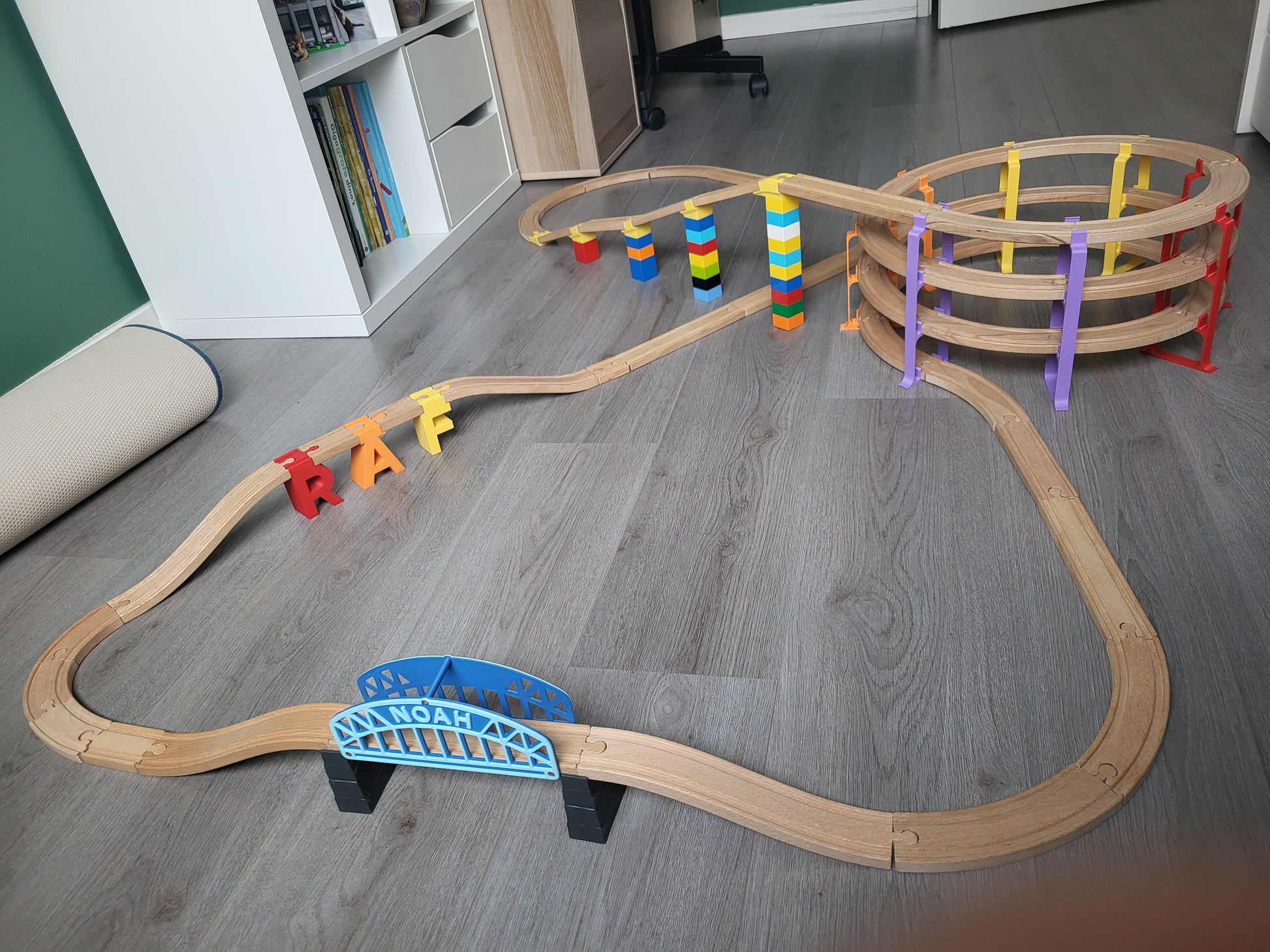 This personalized (name) bridge pillar is designed as an extension for wooden toy train tracks and is compatible with all major brands, such as Brio, IKEA/Lillabo, Lidl, Hape, Eichhorn, and more.